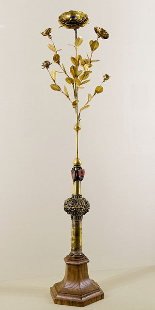 Golden_Rose-150x300 Significado dos símbolos e simbologia – parte 1Símbolo do papa, que é o chefe da igreja católica. A Rosa de Ouro surgiu no início da Idade Média. A primeira referência esta testemunhada numa bula de 1049, pela qual Leão IX isentou o Convento de Santa Cruz de Woffenheim (Alsácia), com a condição da abadessa enviar anualmente uma rosa de ouro à Santa Sé. A crônica de São Martinho de Tours que a mais antiga das ‘’rosas de ouro’’ conhecida é aquela enviada pelo Papa Urbano II a Fulque IV de Anjou, em 1096. Desde a Baixa Idade Média a honraria da Rosa de Ouro para honrar um soberano substituiu a honraria das Chaves da Confissão de São Pedro, ou Chaves de Ouro, instituída no século VIII, pelo Papa Gregório II. A data exata da instituição da rosa é desconhecida. De acordo com algum é anterior a Carlos Magno (742-814), de acordo com outros teve sua origem no fim do século XII; mas, certamente já existia antes do ano 1050, quando o Papa Leão IX (1051) fala da Rosa de Ouro como uma instituição já antiga, em seu tempo. O costume de oferecer a Rosa de Ouro, teve início quando os papas transferiram-se para Avinhão, continuando depois que o papado retornou para Roma. O príncipe condecorado recebia a Rosa de Ouro do papa, em solene cerimônia, sendo acompanhado pelo Sacro Colégio dos Cardeais. No início do século XVII passou a ser ofertada somente a rainhas e princesas. Aos imperadores, reis e príncipes eram ofertado presentes mais apropriados, como espadas. Mas, se um monarca estivesse presente em Roma, no Domingo Lætare, ele poderia receber a Rosa de Ouro. O ofício de entregar a Rosa de Ouro aos que residiam fora de Roma foi dado, pelos papas aos Cardeais Legados, aos núncios, aos internúncios e aos delegados apostólicos. Em 1895 foi criado um novo ofício, chamado de Portador da Rosa ou Zelador da Rosa, cargo não hereditário, destinado aos príncipes católicos, aos camareiros secretos de capa e espada ou a uma membro da Prefeitura da Casa Pontifícia. Este cargo foi posteriormente extinto. Em tempos mais recentes, depois do Concílio Vaticano II, a condecoração pontifícia passou a ser um presente dos papas a Nossa Senhora. No século X entrou na liturgia do quarto domingo da quaresma a singular Bênção da Rosa, sendo que em Roma a rosa passou a ser de ouro. O papa ia, do Palácio de Latrão à Basílica estacional de Santa Cruz de Jerusalém, levando na mão esquerda uma rosa de ouro que significava a alegria pela proximidade da Páscoa. Com a mão direita, o papa abençoava a multidão. Regressando, processionalmente a cavalo, o papa tinha sua montaria conduzida pelo prefeito de Roma. Ao chegar, presenteava o prefeito de com a rosa, em reconhecimento pelos seus atos de respeito e homenagem. Inicialmente, a rosa era levada pelo próprio papa. Mas, aumentando o peso da rosa, um clérigo foi encarregado desta função. Nesta ocasião, o papa benze na sacristia daquela basílica o bálsamo e o almíscar destinados à rosa que será abençoada. Só depois ela será levada, por um portador, a seu destinatário ou remetida a um embaixador residente em Roma. As rosas mais antigas não eram abençoadas. A bênção foi instituída para solenizar e induzir uma reverência maior por parte de quem a recebia.
