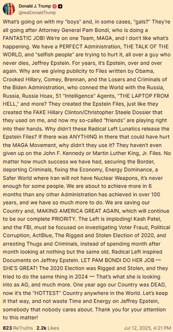 O presidente dos EUA pede aos americanos que se calem e esqueçam a rede de chantagem pedófila das agências de informação. O presidente Donald Trump publicou uma mensagem no Truth Social no sábado, criticando aqueles que criticaram a procuradora-geral Pam Bondi por não produzir os tão aguardados “Arquivos Epstein”, depois de esta ter dito ao público que o FBI tinha “dezenas de milhares de vídeos de Epstein com crianças, ou pornografia infantil”.
